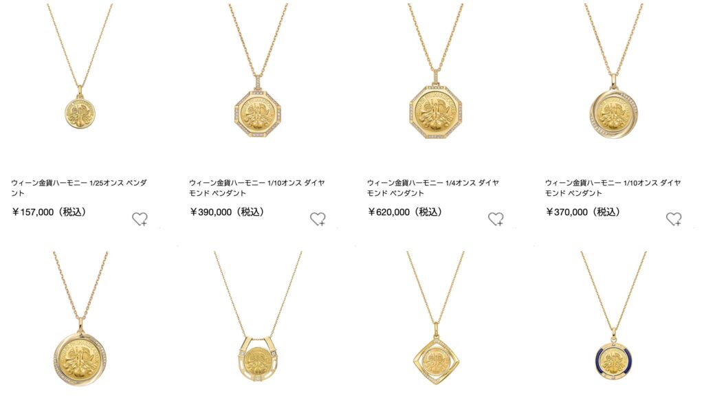 ウィーン金貨・メイプルリーフ金貨(24K)などはコインネックレスに加工されたものが販売されています。