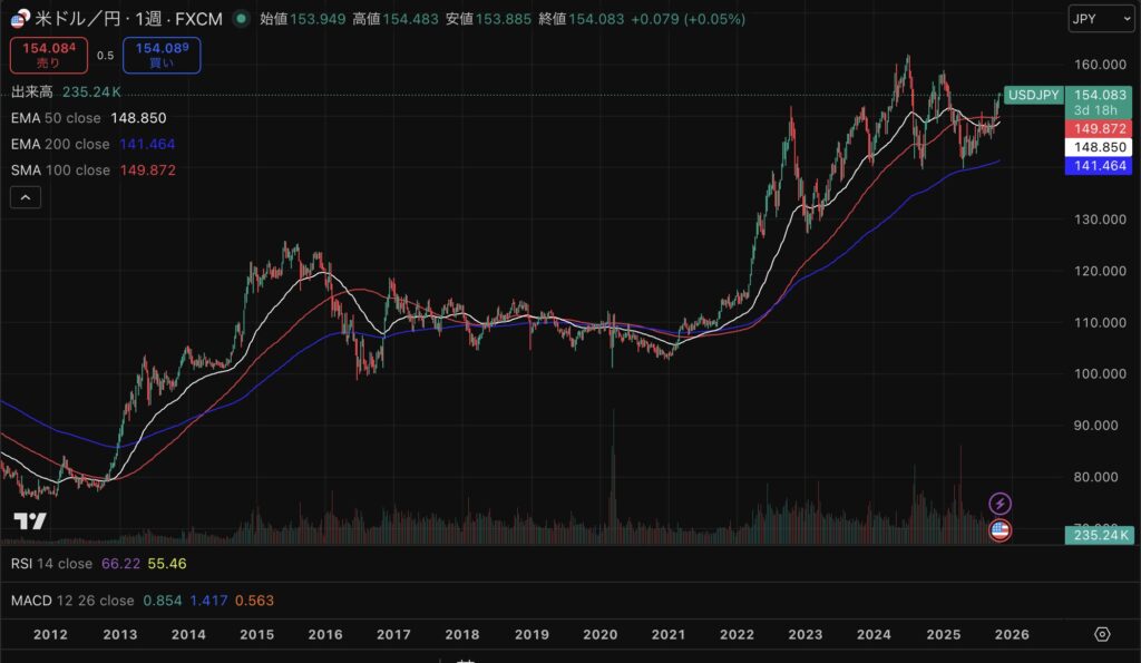 2025年現在、1ドル=150円前後と、歴史的な円安水準。